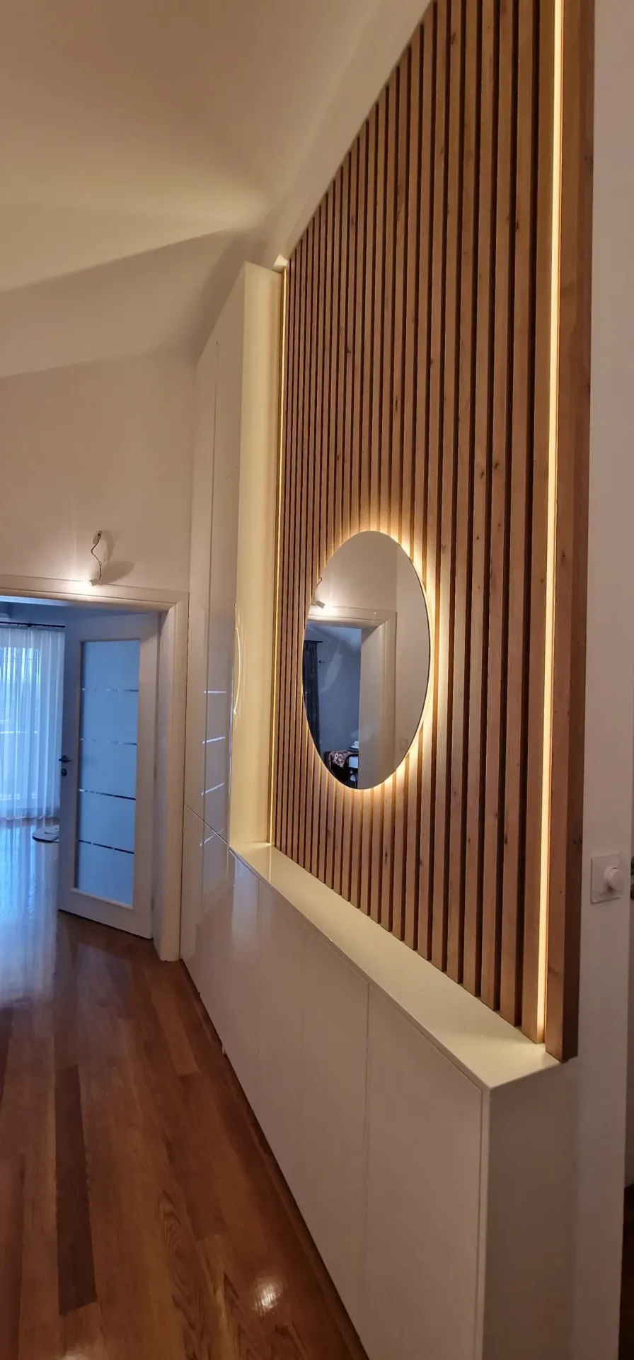 The design of your hallway as a harmonious and attractive part of the whole of your living space can be offered by our experienced team of designers. Countless variations of light and discreet wardrobes, built in or made as an introduction into the experience of the rest of the space; footwear cabinets, countless shapes of mirrors adapted to the space, umbrella stands…