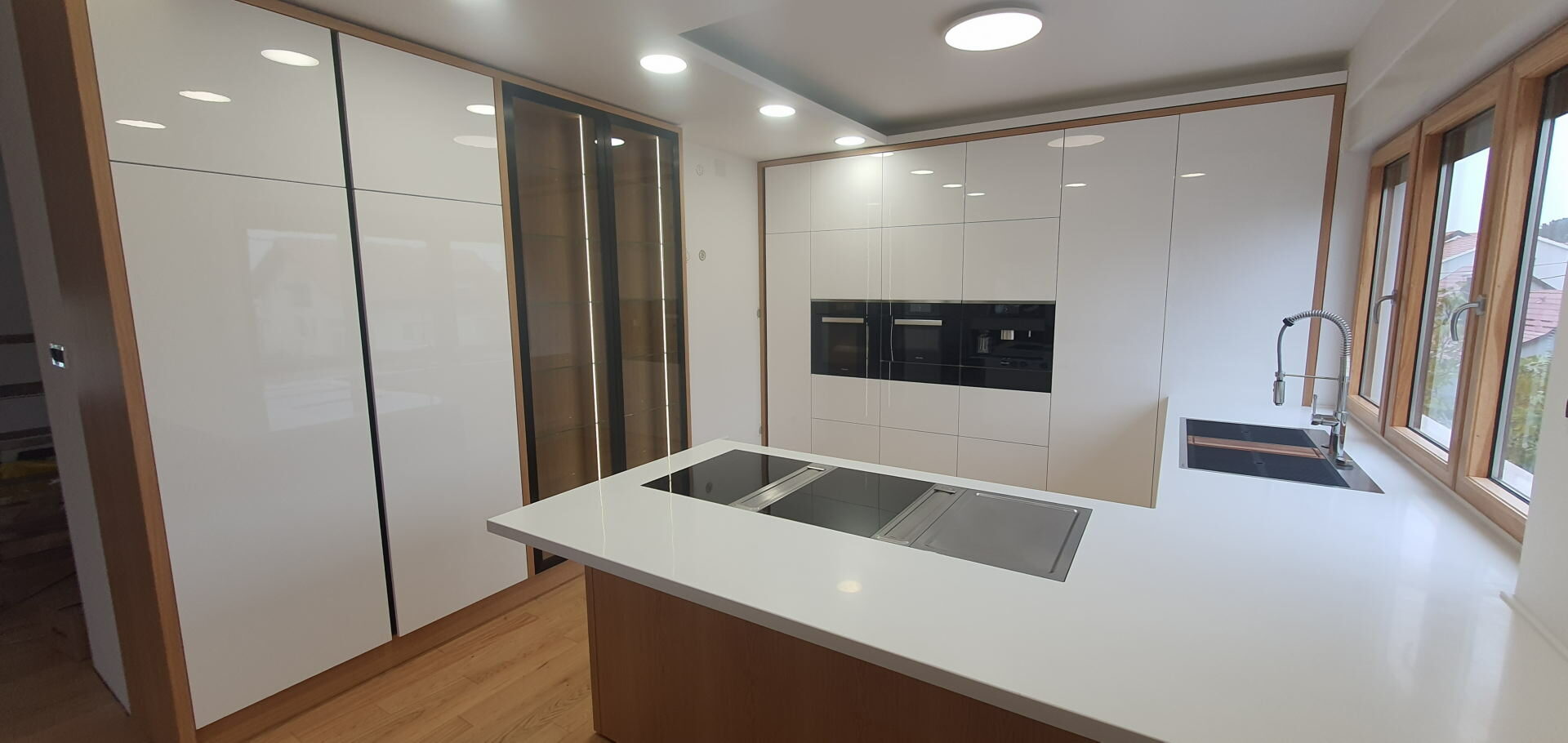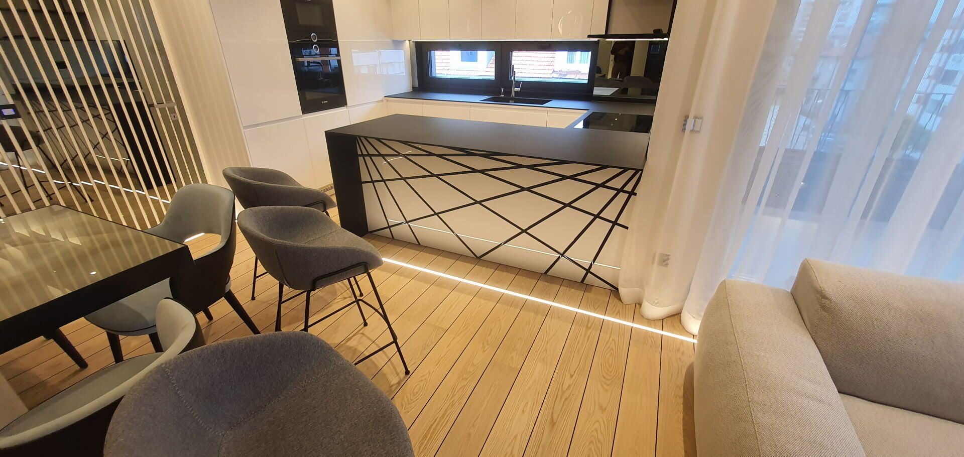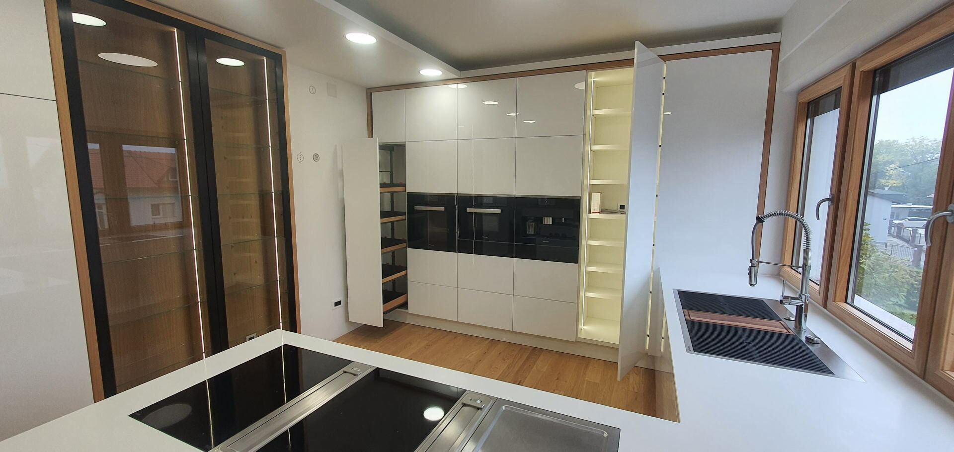 We provide the manufacture of such kitchen with elegant, attractive and modern solutions in countless different shades of colors with the possibility of installing high-quality appliances. At the same time they perfectly fit into the composition of the whole space through style and color. Range is from classic shapes to attractive futuristic design. Available details are numerous: from door elements made of laminated chipboard with stainless steel detailing, aluminum and other suitable materials.