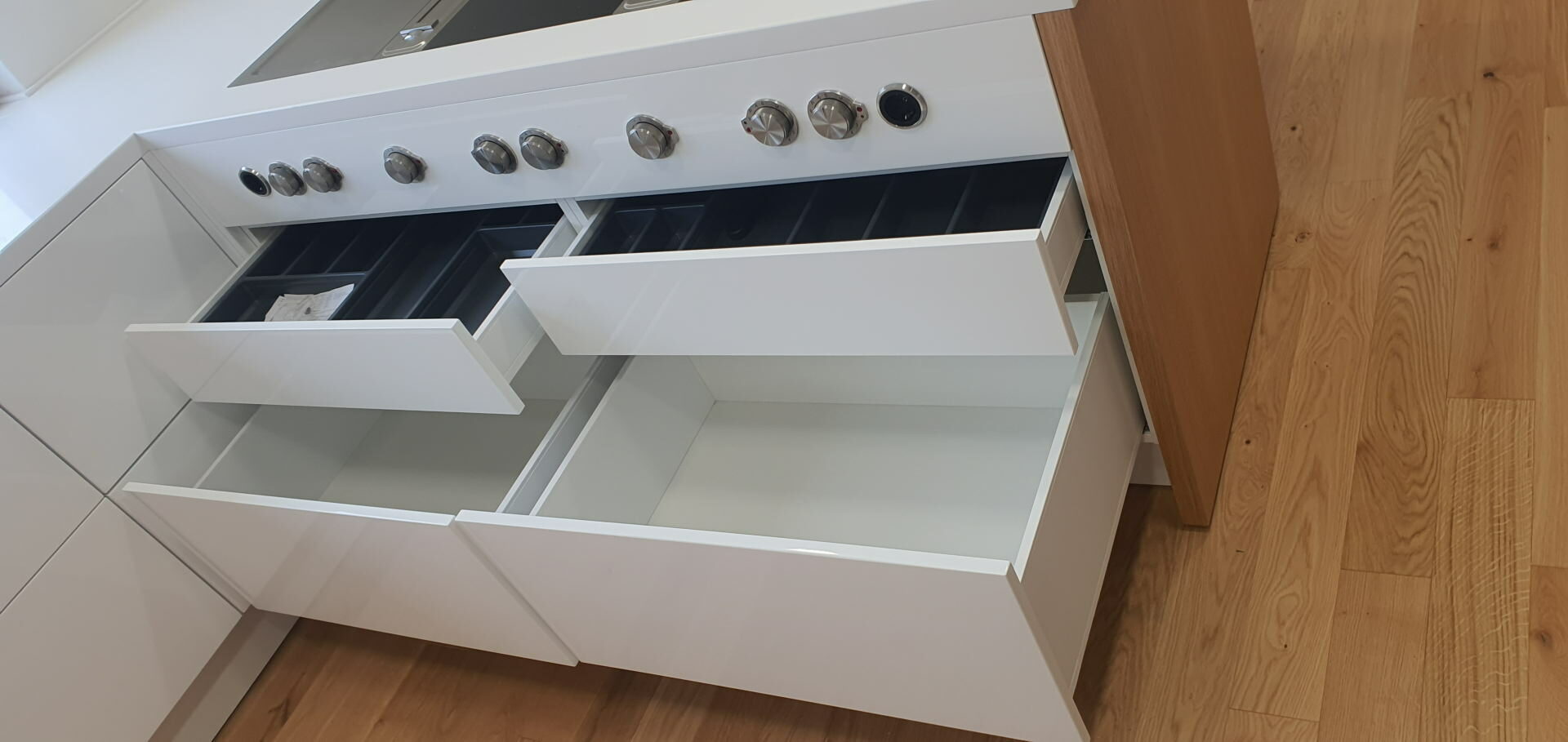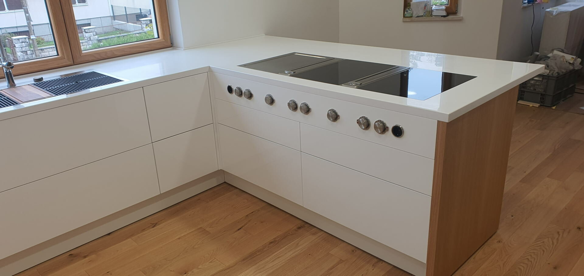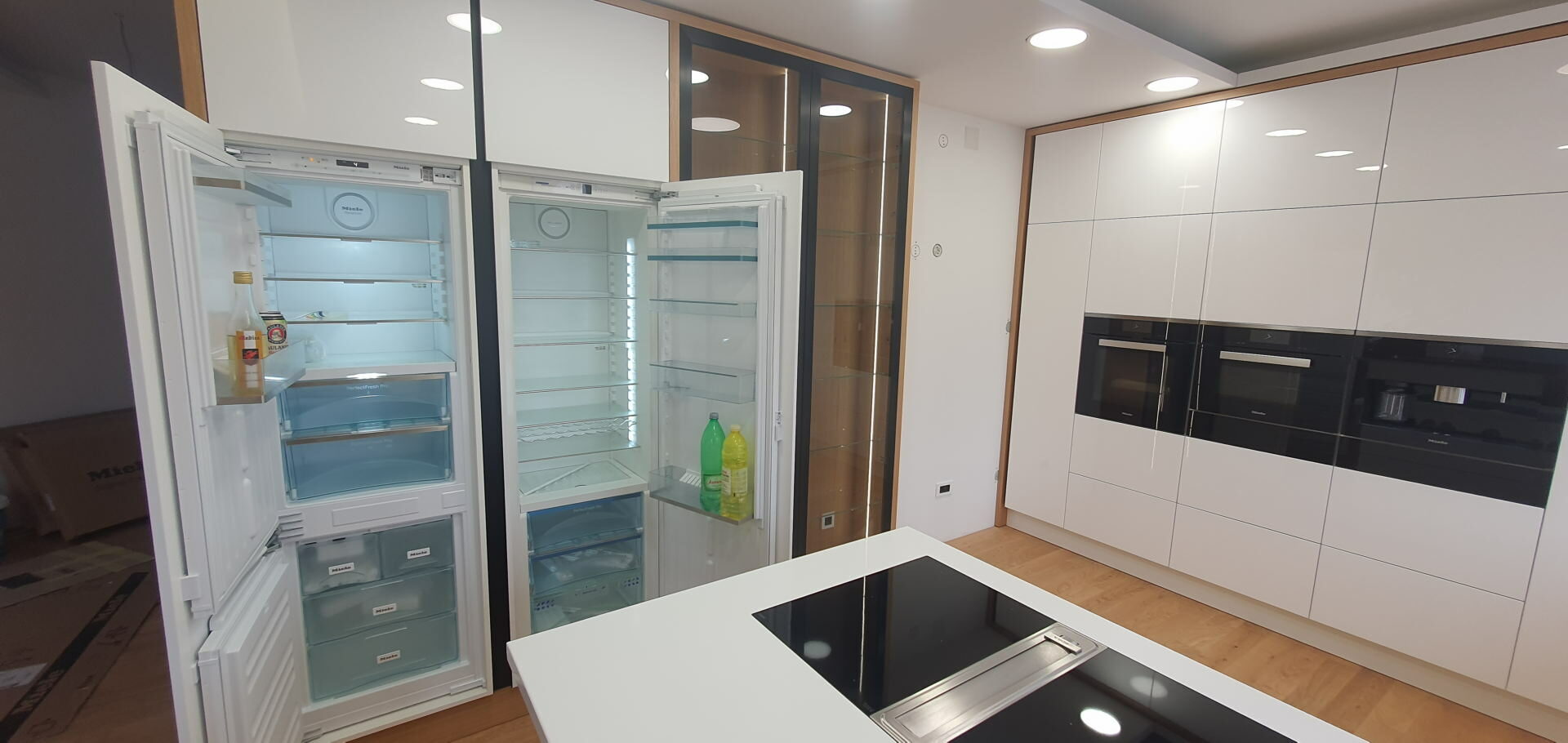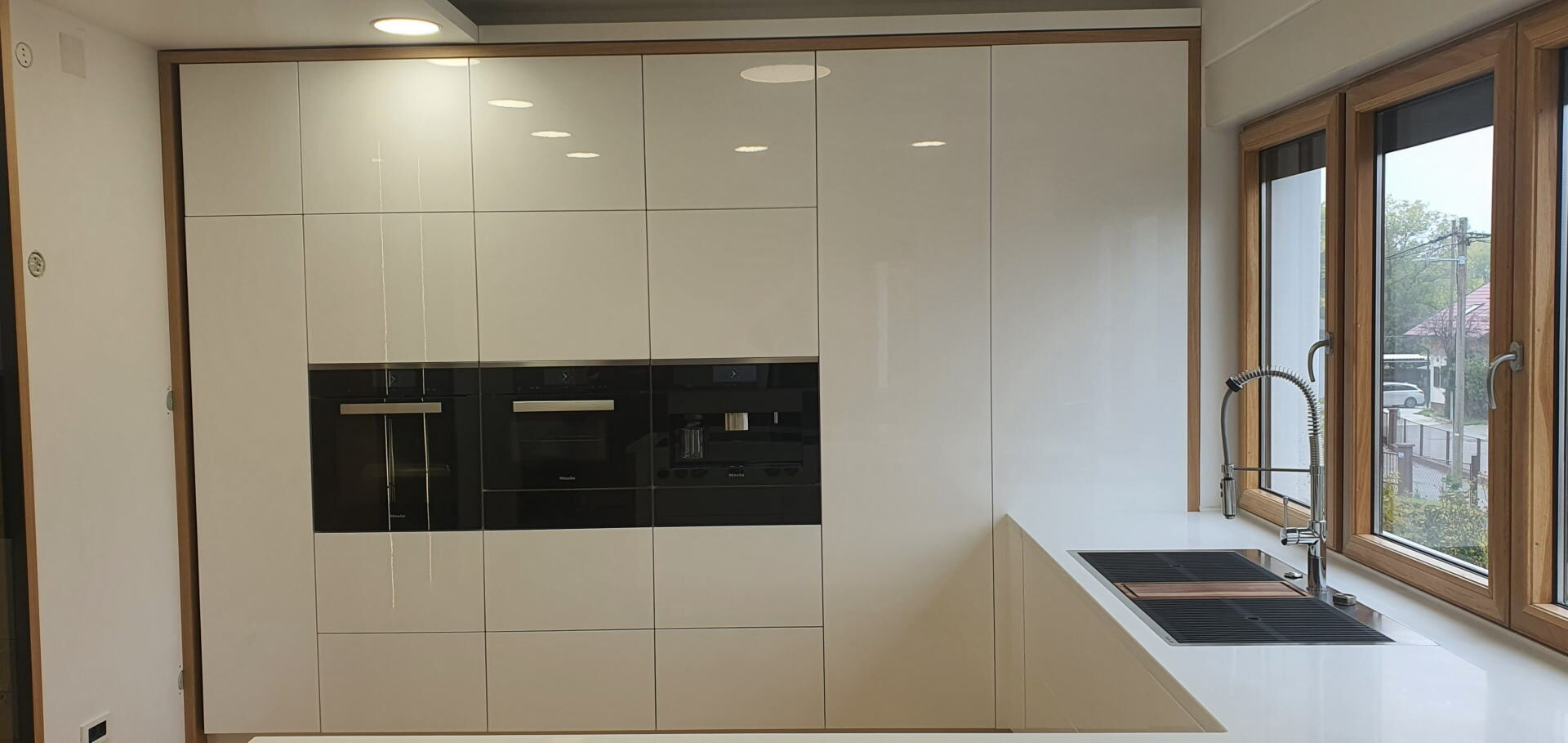 In manufacturing the body of the kitchen there is a series of top material suppliers like KAINDL with a wide variety of décor, high quality hinges from different suppliers whose supply can meet all you requirements ( Clip, Tandembox and Metabox drawers). Pull and rotary baskets PEKA- Switzerland and other supporting hardware (bins, lighting, wall baskets, handles, aluminum frames, kitchen hoods, sinks). MIELE, SCHACHERMAYER, Elgrad-EGGER are the names that will ensure that the offer of performance features is greater than the request, which is rare. Painting massive parts is made with top PU or water-based varnish in three layers.