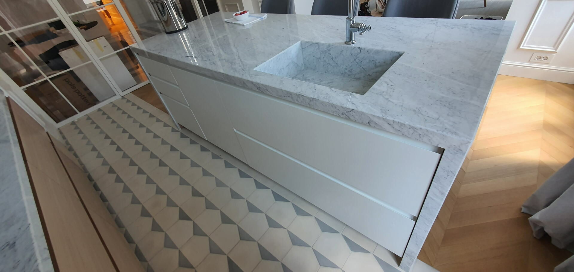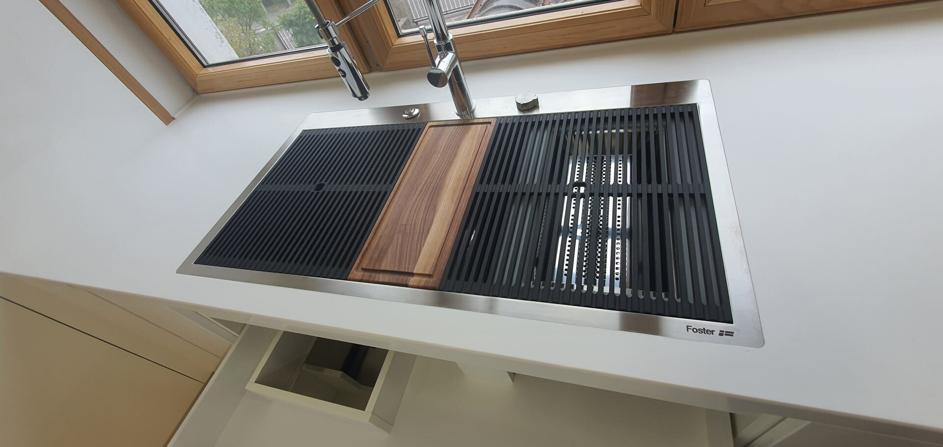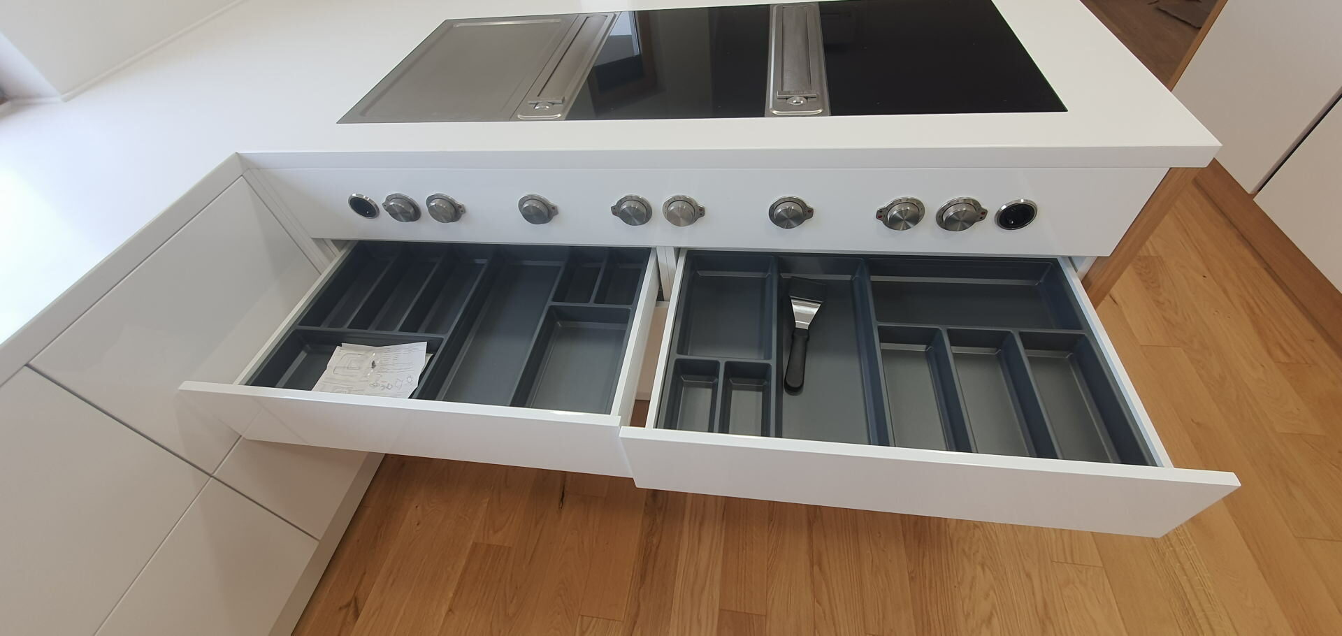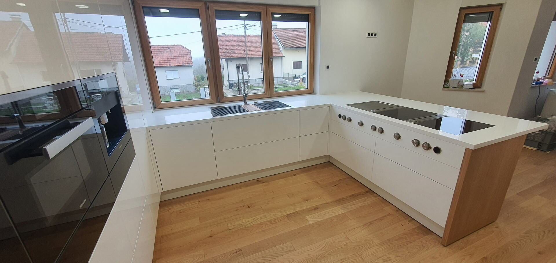 In manufacturing the body of the kitchen there is a series of top material suppliers like KAINDL with a wide variety of décor, high quality hinges from different suppliers whose supply can meet all you requirements ( Clip, Tandembox and Metabox drawers). Pull and rotary baskets PEKA- Switzerland and other supporting hardware (bins, lighting, wall baskets, handles, aluminum frames, kitchen hoods, sinks). MIELE, SCHACHERMAYER, Elgrad-EGGER are the names that will ensure that the offer of performance features is greater than the request, which is rare. Painting massive parts is made with top PU or water-based varnish in three layers.